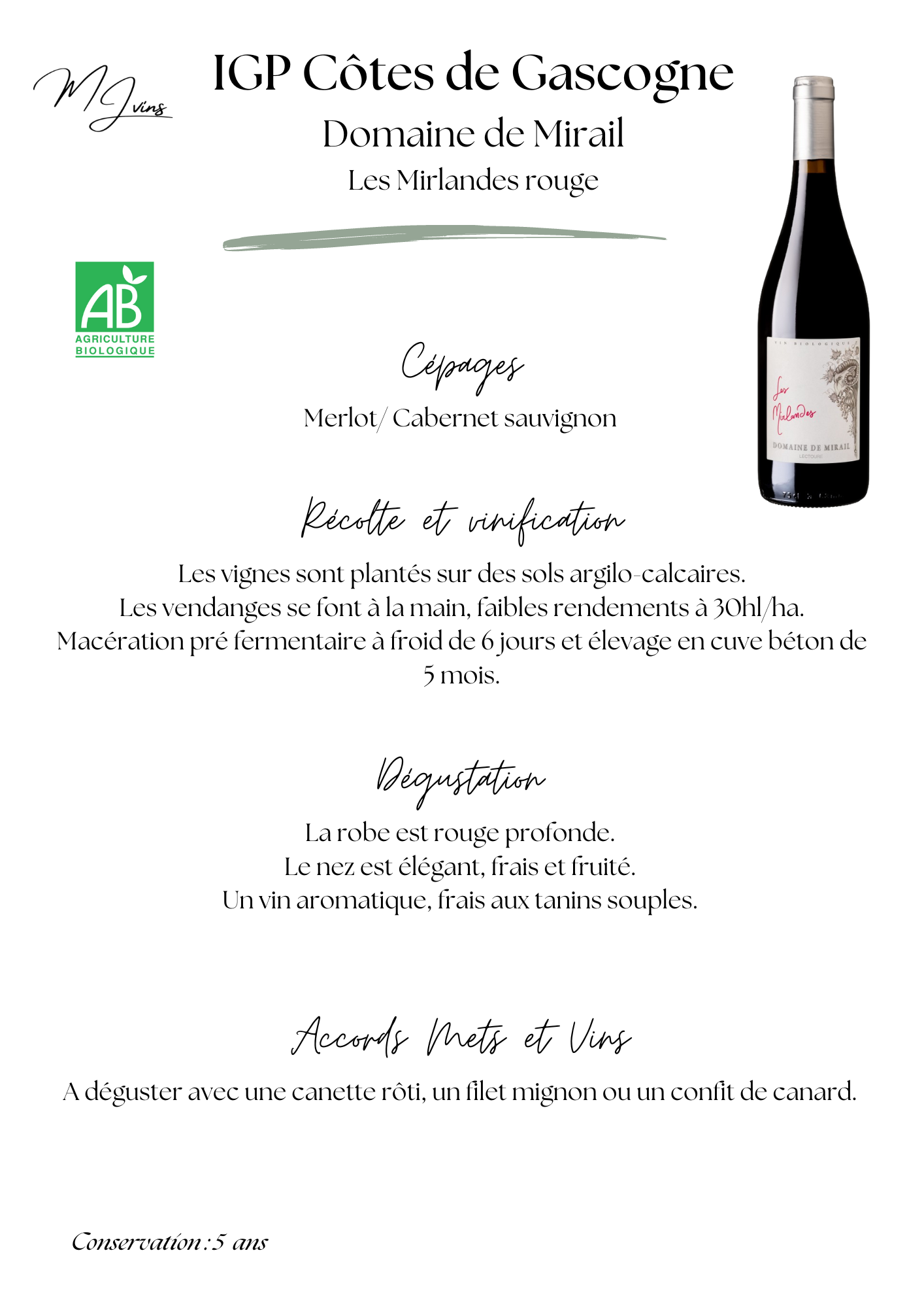 Domaine de MirailIGP Côtes de GascogneBouteille de 75 cl / 13° |